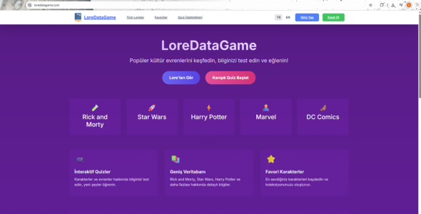 LoreDataGame is a simple bilingual website about TV shows, movies, and fictional worlds that uses live data from eight different APIs. The frontend is built with React and Next.js, and the backend runs on .NET Core with an MSSQL database. After you sign up, you can save your favorite characters and challenge friends with quizzes.